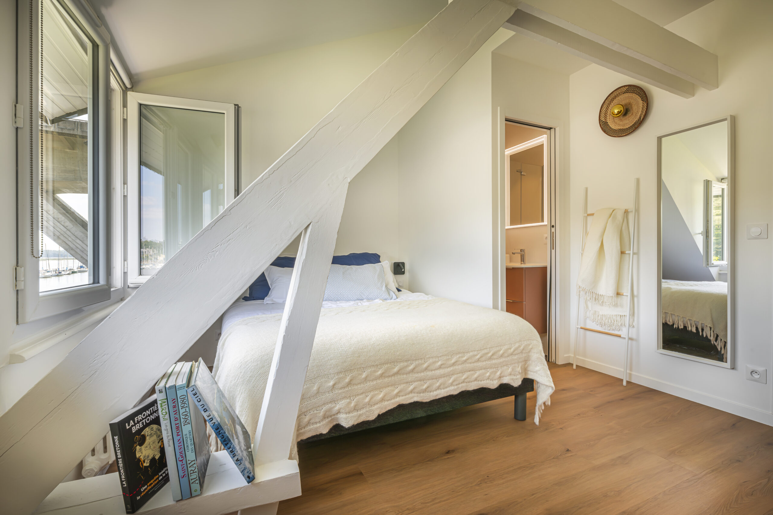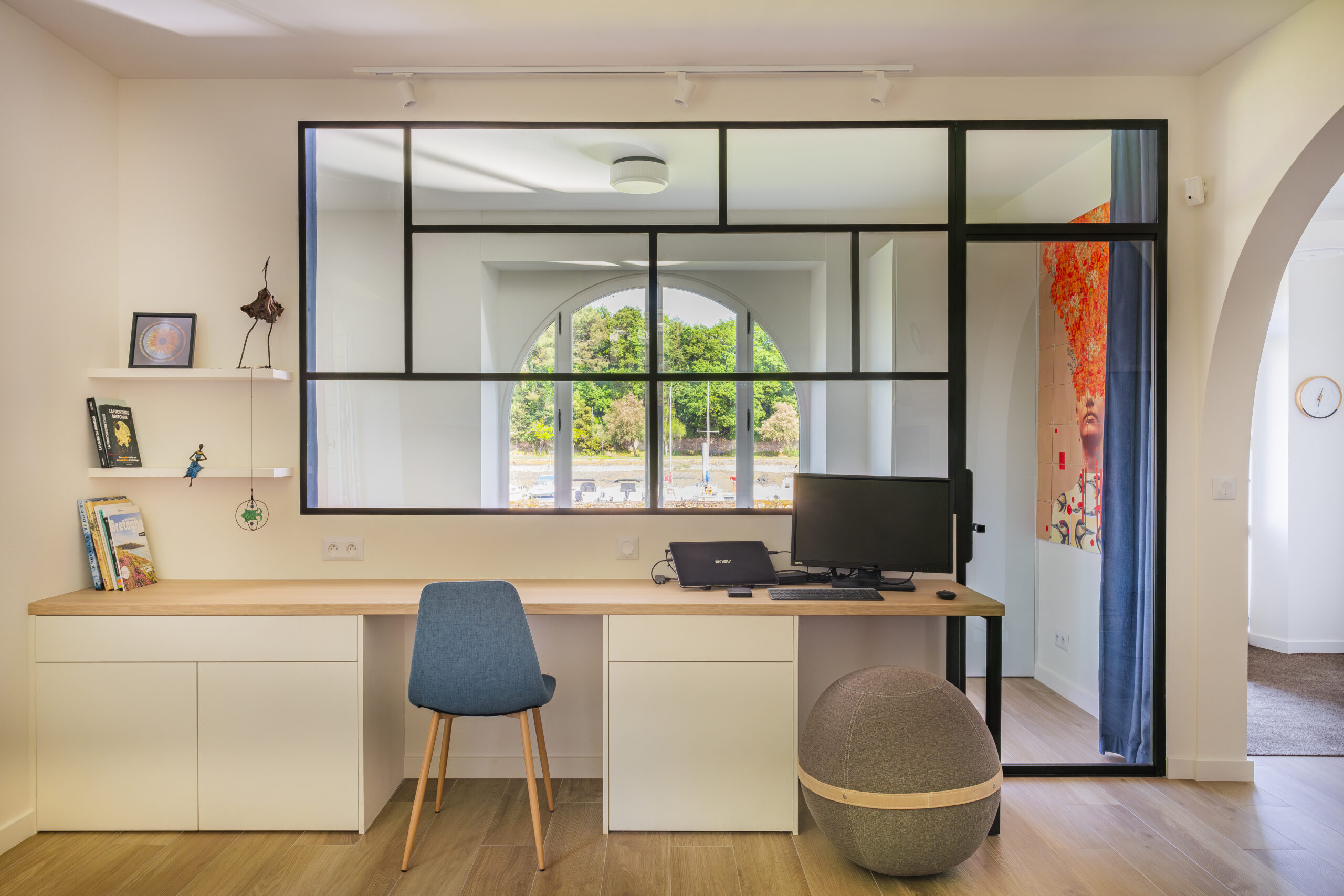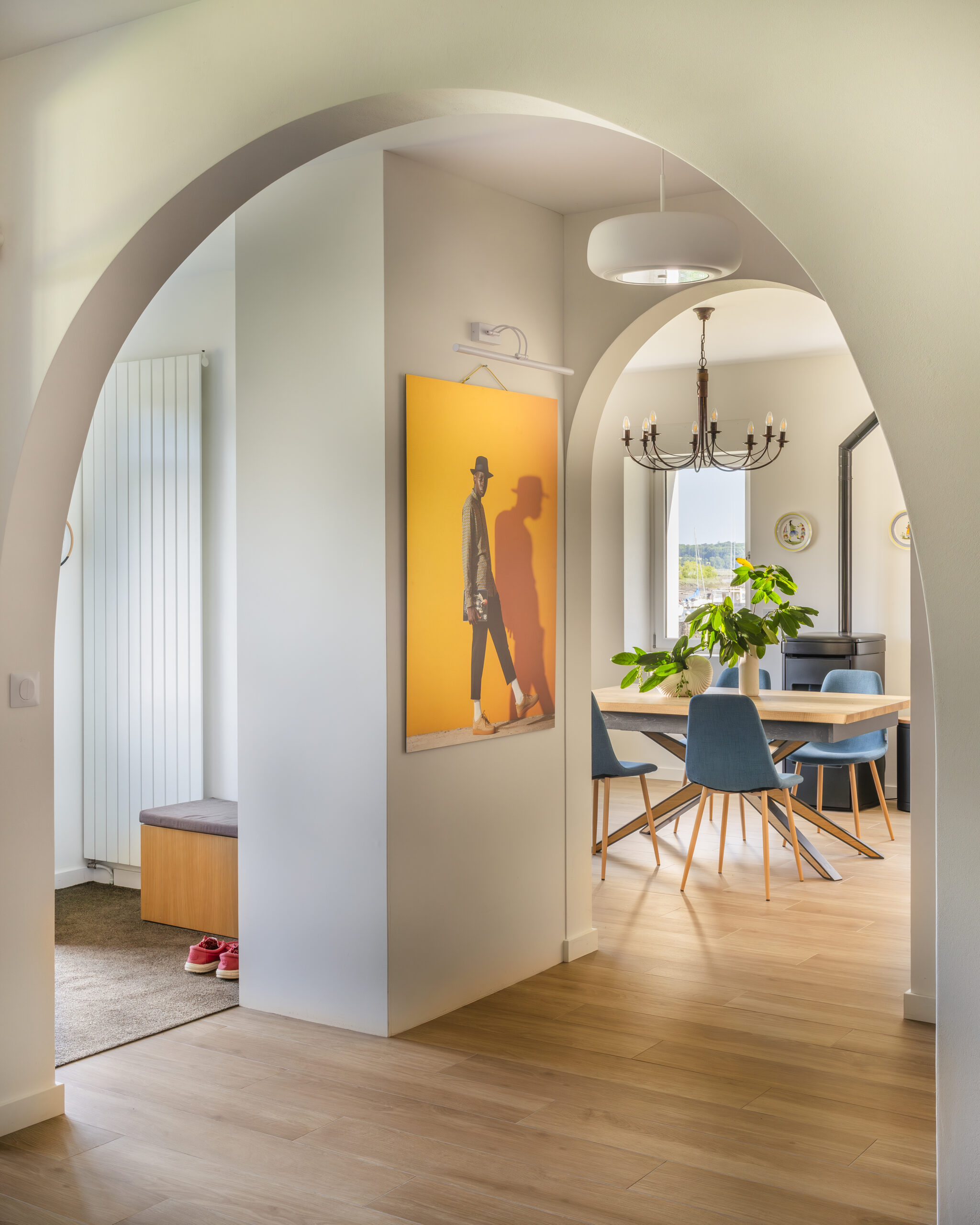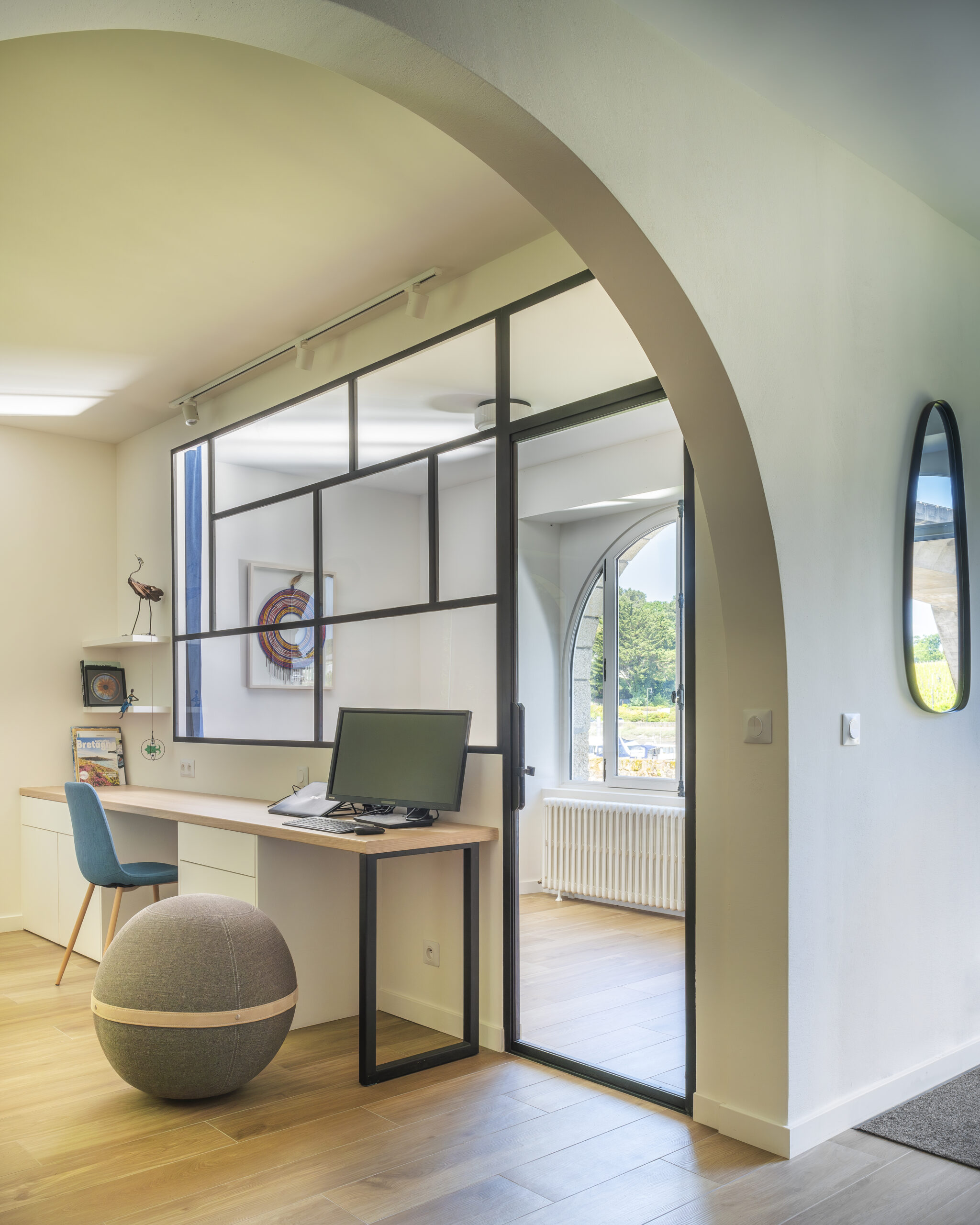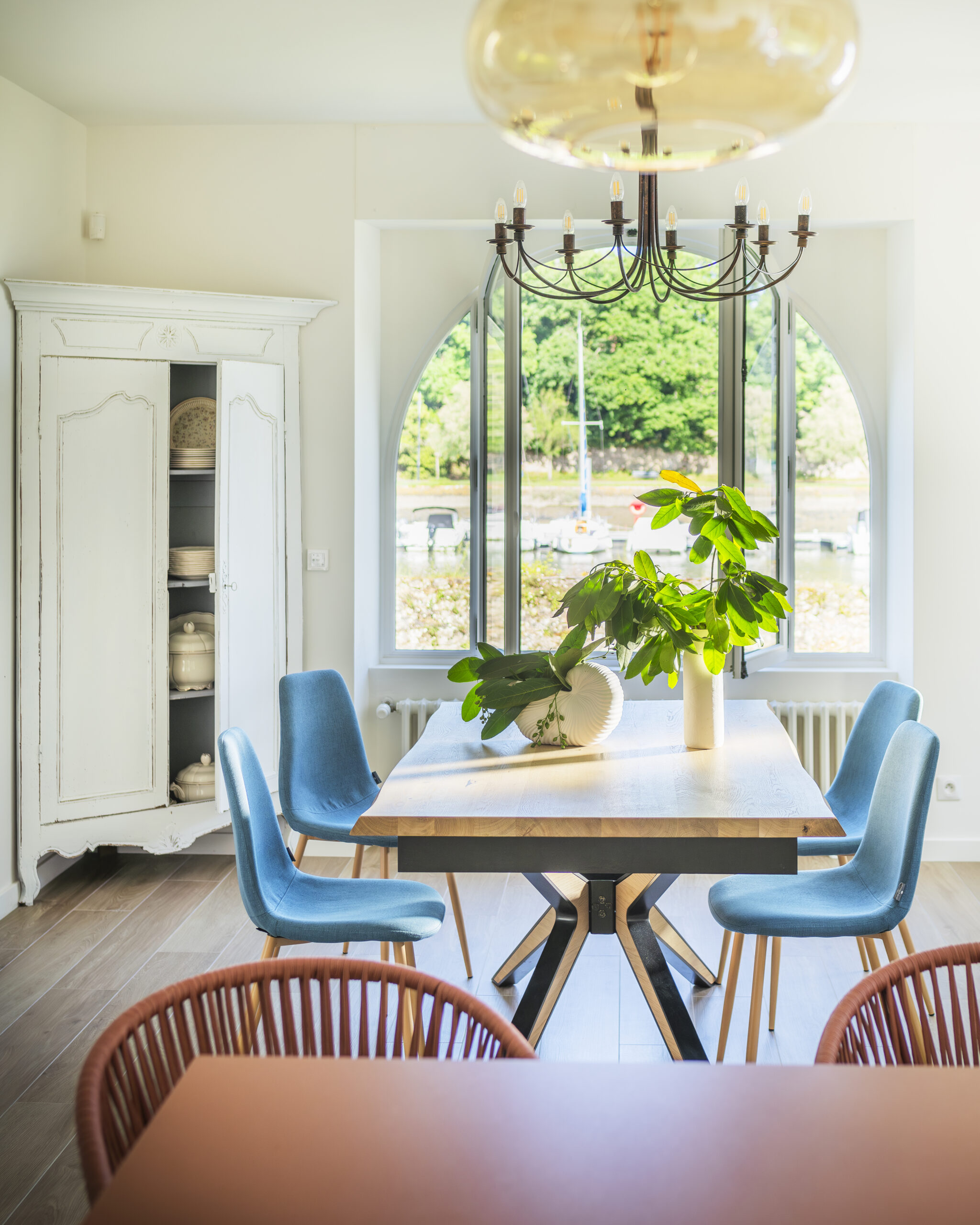 Les clients ont eu un immense coup de cœur pour cette charmante maison située sur les bords de la rivière d’Auray. Une transformation radicale des lieux a été nécessaire pour en faire une maison de vacances fonctionnelle et baignée de lumière ; la maison était, en effet, très cloisonnées avec de petites ouvertures. Une fois les contraintes techniques d’isolation et d’étanchéité des lieux résolues, les espaces ont été ouverts pour bénéficier de la vue au maximum. 4 chambres ont été créées avec de beaux volumes, dont une grande chambre dortoirs pour les enfants. Concernant les pièces à vivre, des ouvertures arrondies, répondant à celui des fenêtres, ont été réalisées dans certains murs porteurs. L’aménagement et la décoration a été un travail d’équipe. Amateurs d’art, les propriétaires ont su mettre en couleur les différents espaces.