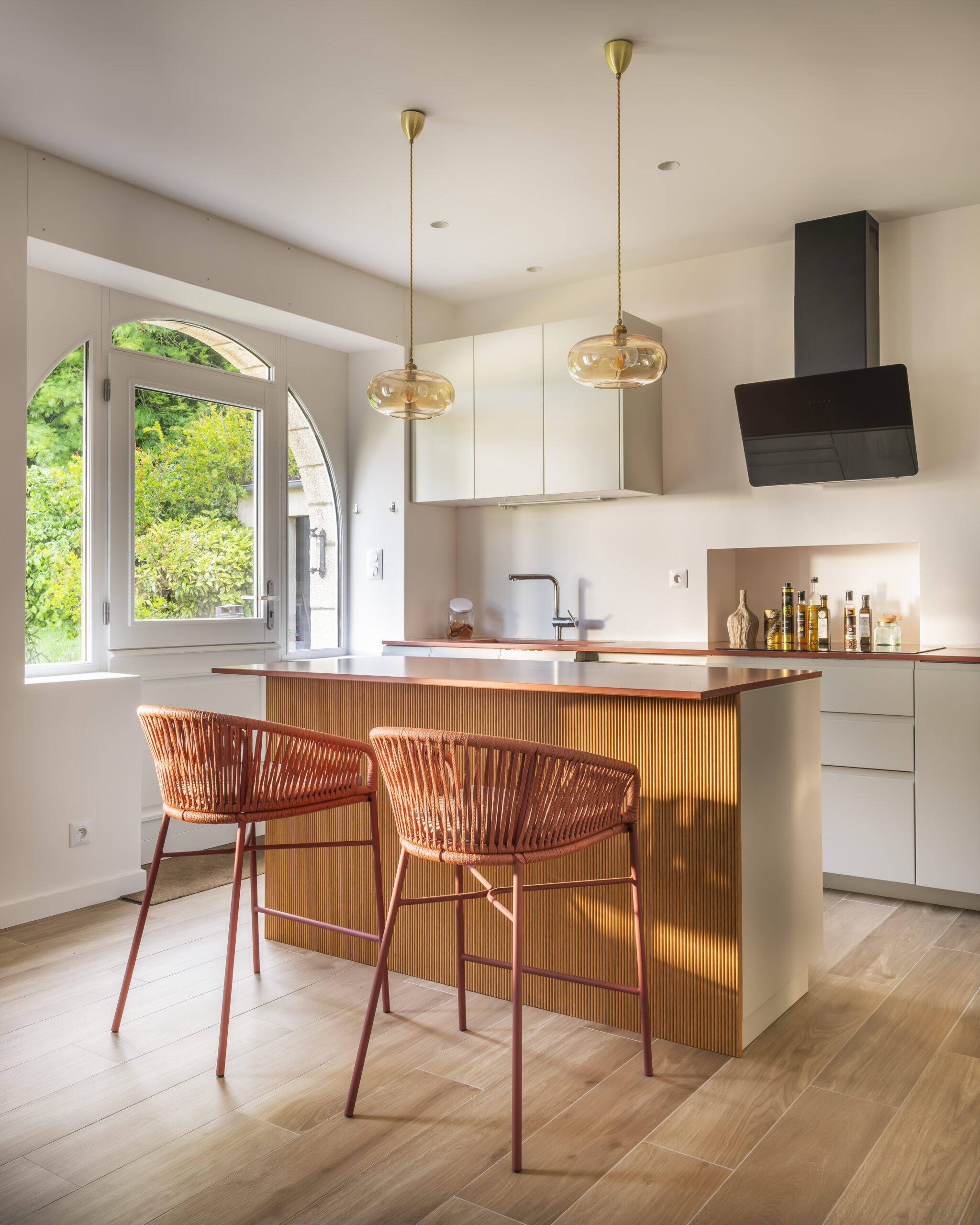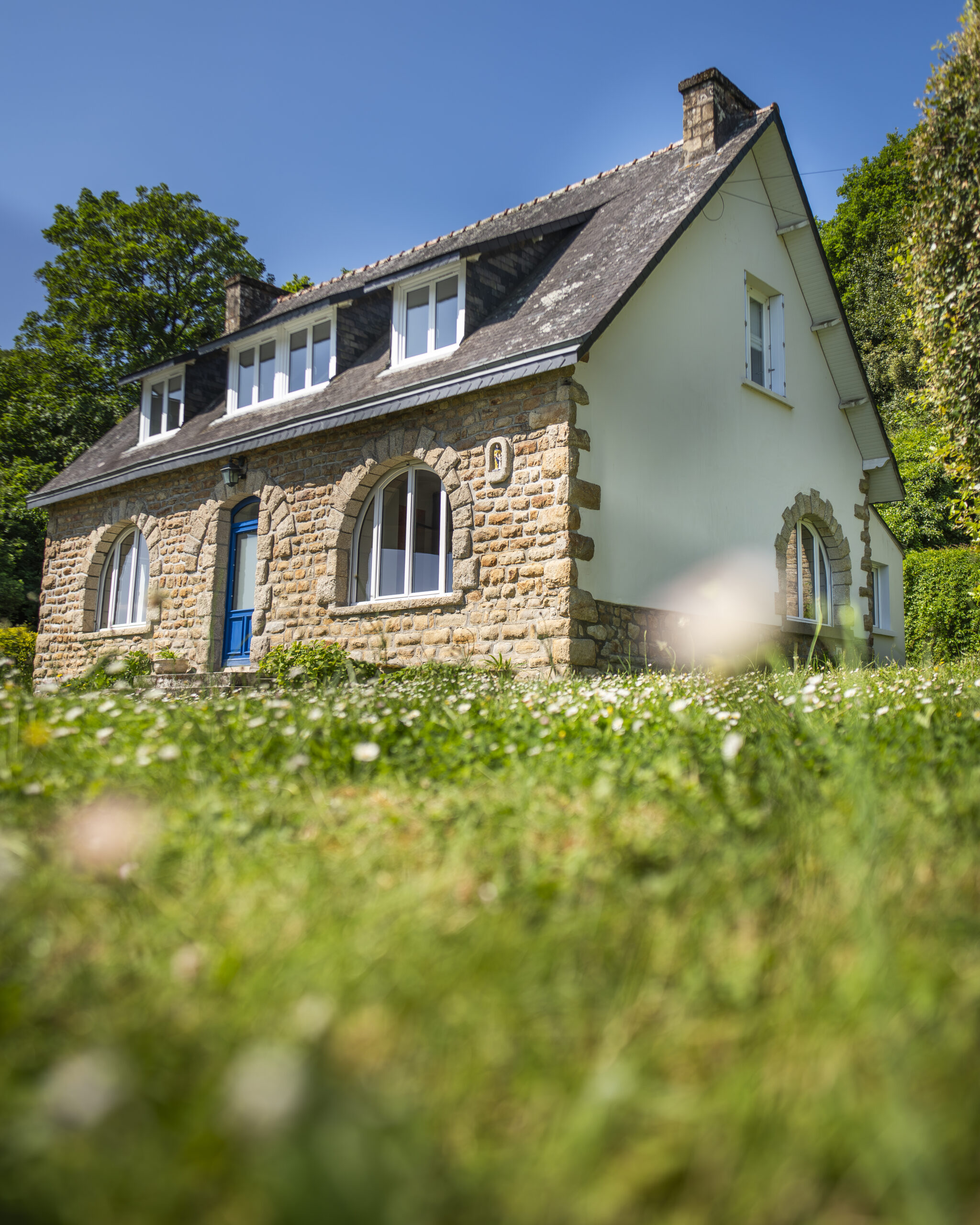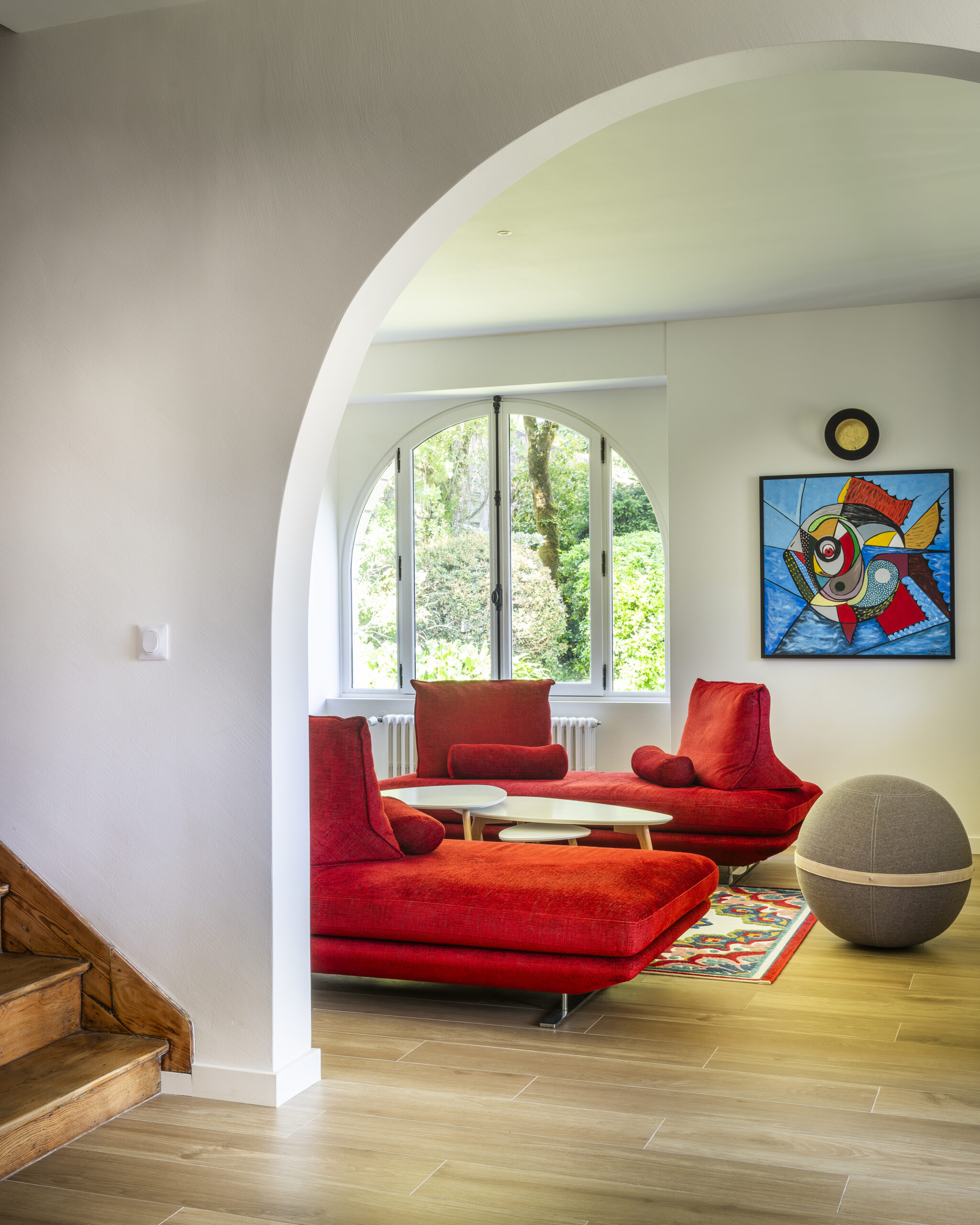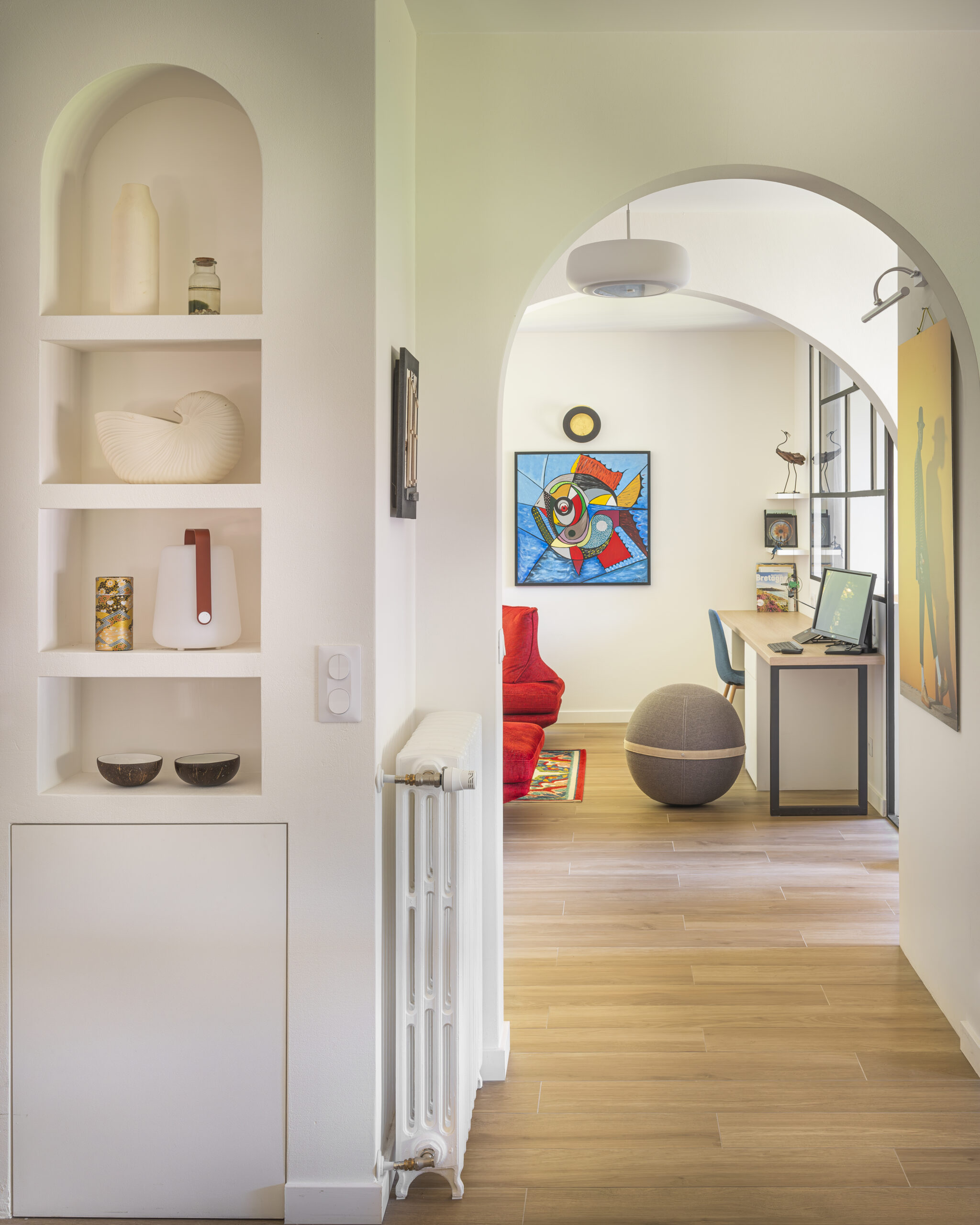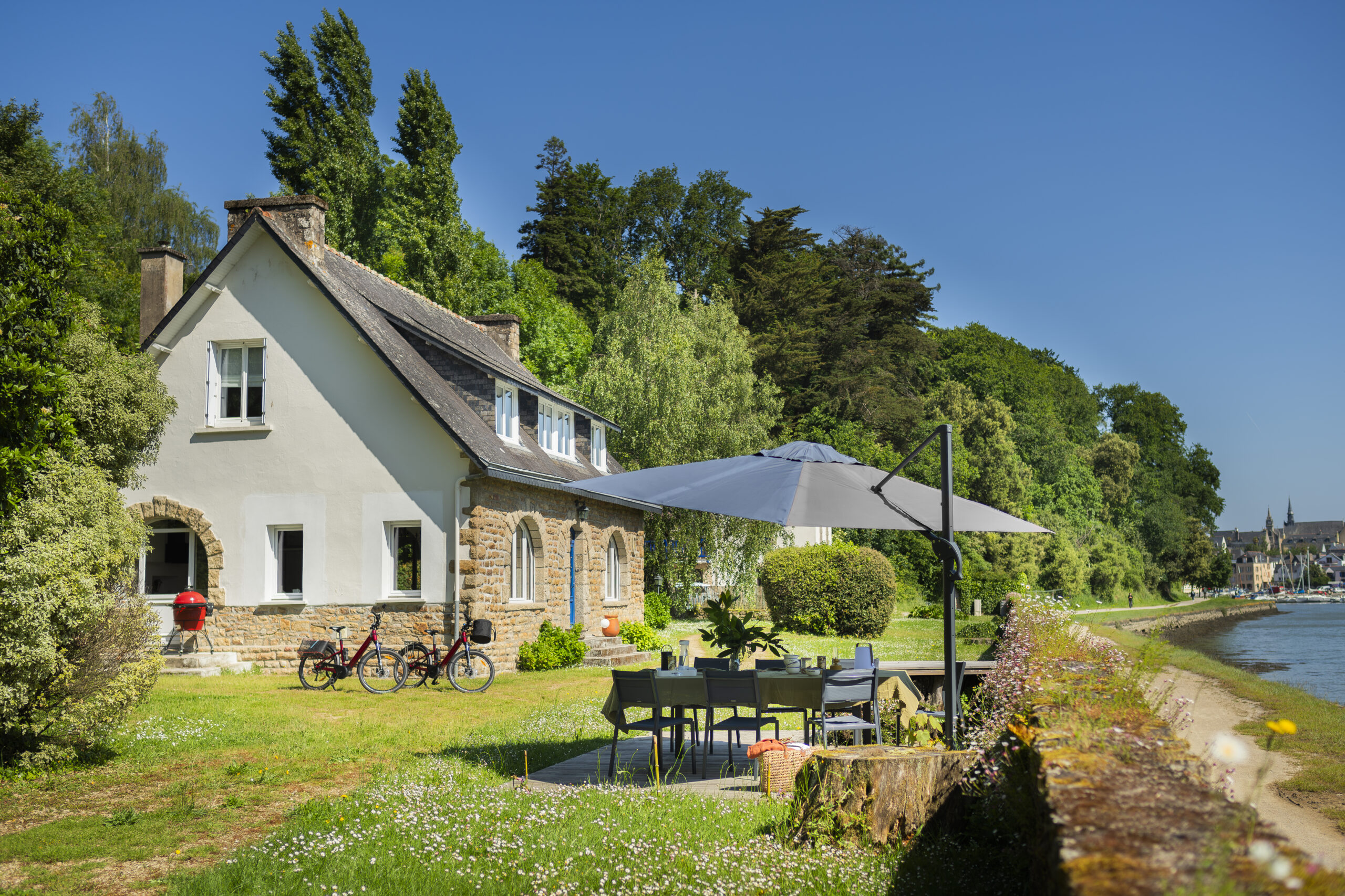 Les clients ont eu un immense coup de cœur pour cette charmante maison située sur les bords de la rivière d’Auray. Une transformation radicale des lieux a été nécessaire pour en faire une maison de vacances fonctionnelle et baignée de lumière ; la maison était, en effet, très cloisonnées avec de petites ouvertures. Une fois les contraintes techniques d’isolation et d’étanchéité des lieux résolues, les espaces ont été ouverts pour bénéficier de la vue au maximum. 4 chambres ont été créées avec de beaux volumes, dont une grande chambre dortoirs pour les enfants. Concernant les pièces à vivre, des ouvertures arrondies, répondant à celui des fenêtres, ont été réalisées dans certains murs porteurs. L’aménagement et la décoration a été un travail d’équipe. Amateurs d’art, les propriétaires ont su mettre en couleur les différents espaces.