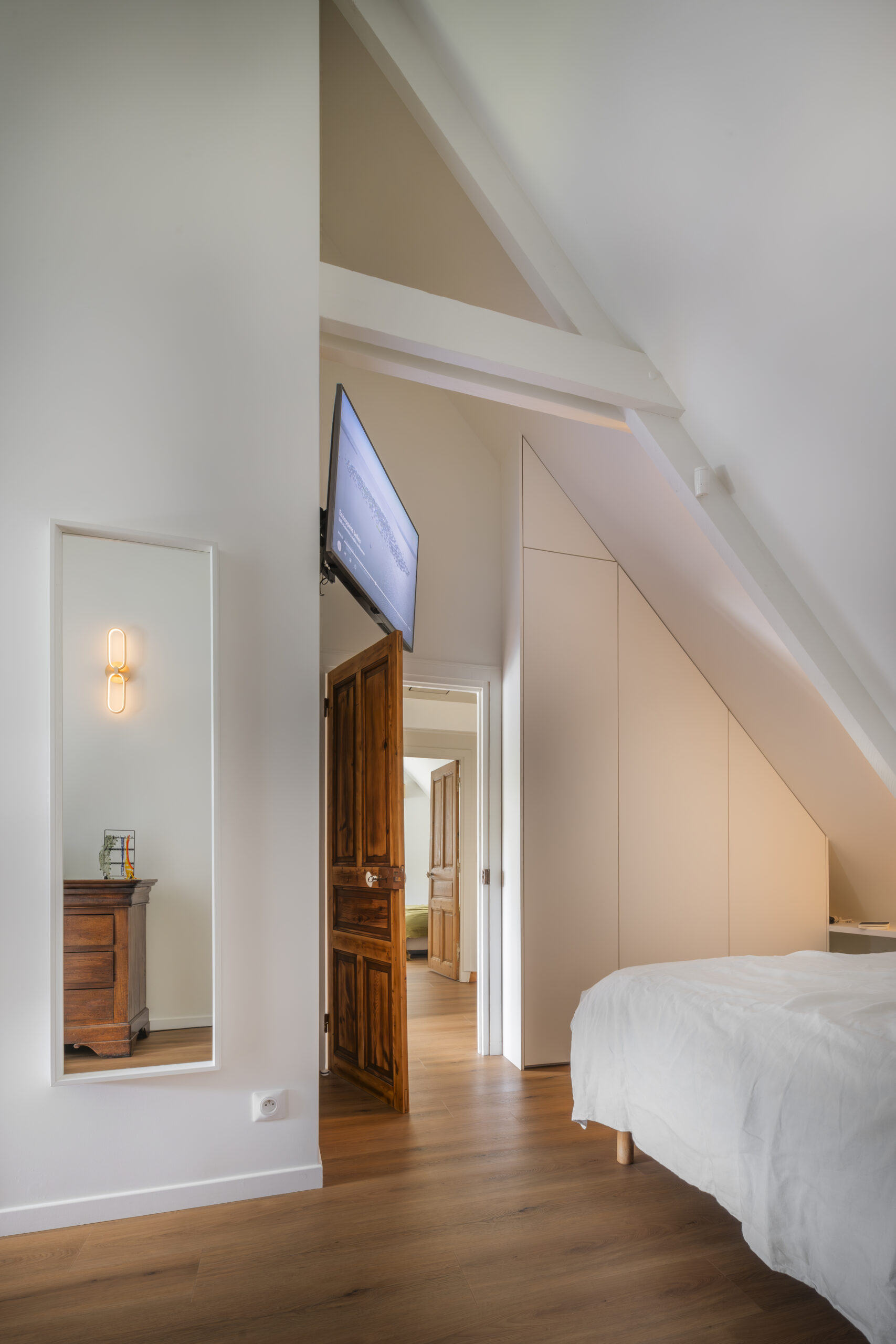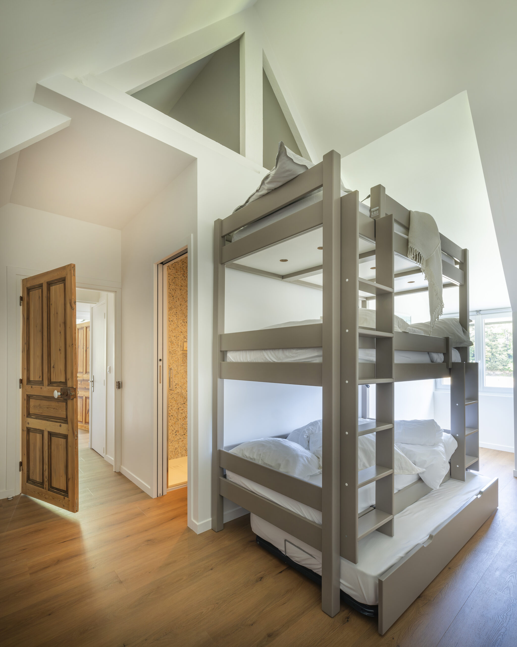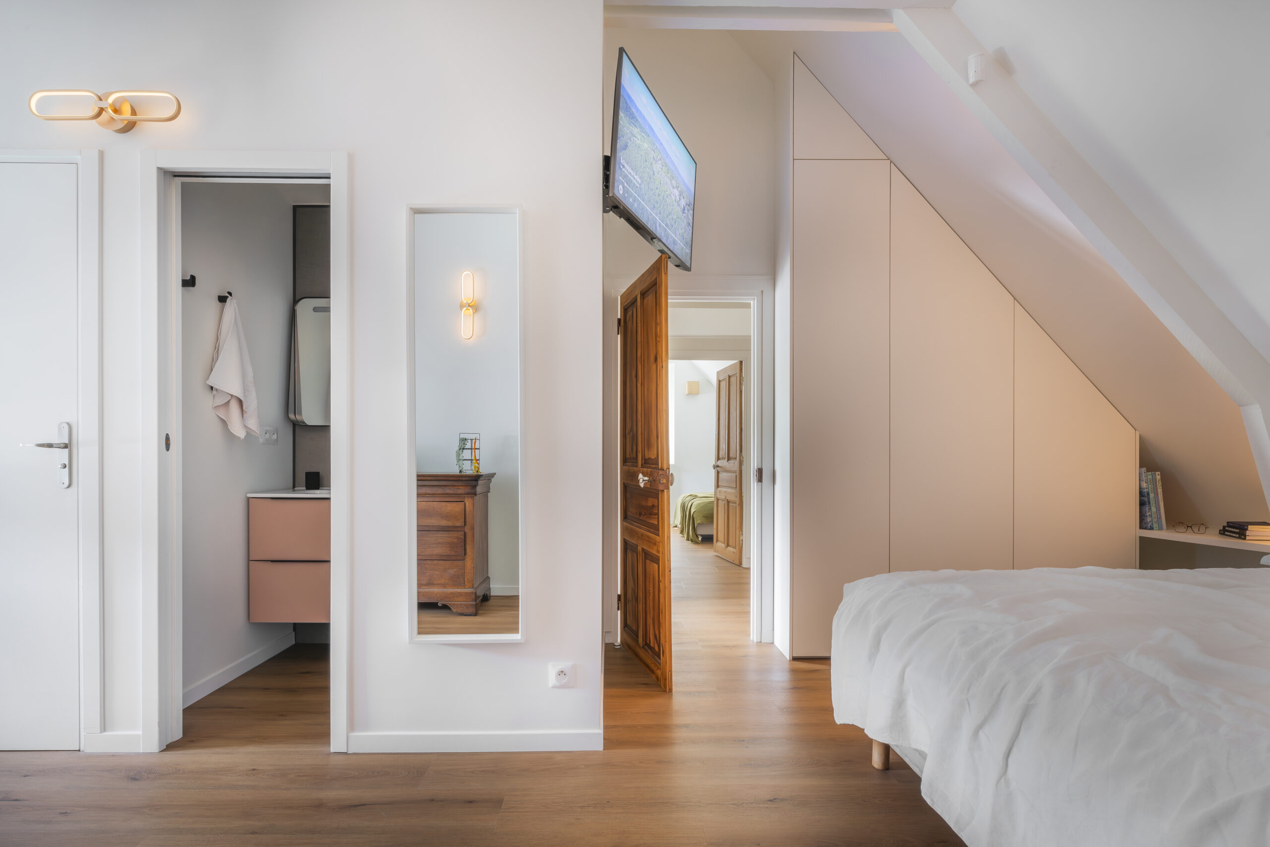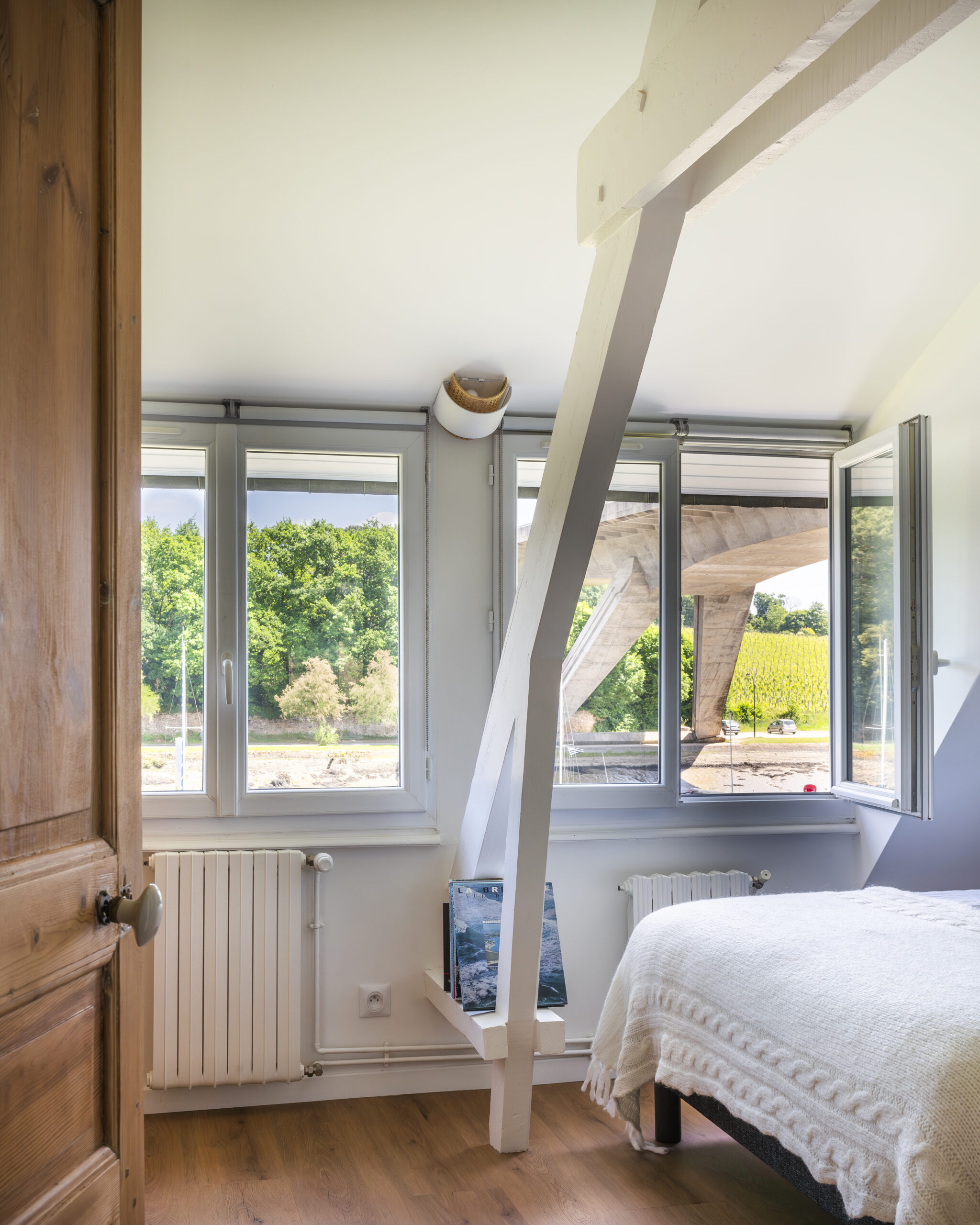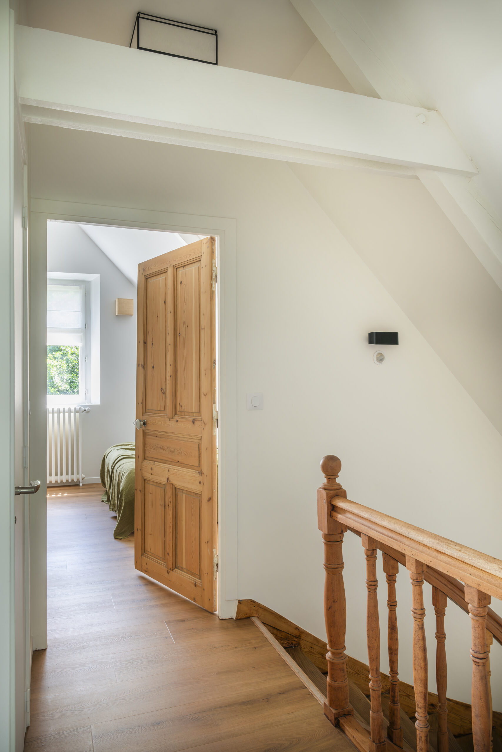 Les clients ont eu un immense coup de cœur pour cette charmante maison située sur les bords de la rivière d’Auray. Une transformation radicale des lieux a été nécessaire pour en faire une maison de vacances fonctionnelle et baignée de lumière ; la maison était, en effet, très cloisonnées avec de petites ouvertures. Une fois les contraintes techniques d’isolation et d’étanchéité des lieux résolues, les espaces ont été ouverts pour bénéficier de la vue au maximum. 4 chambres ont été créées avec de beaux volumes, dont une grande chambre dortoirs pour les enfants. Concernant les pièces à vivre, des ouvertures arrondies, répondant à celui des fenêtres, ont été réalisées dans certains murs porteurs. L’aménagement et la décoration a été un travail d’équipe. Amateurs d’art, les propriétaires ont su mettre en couleur les différents espaces.