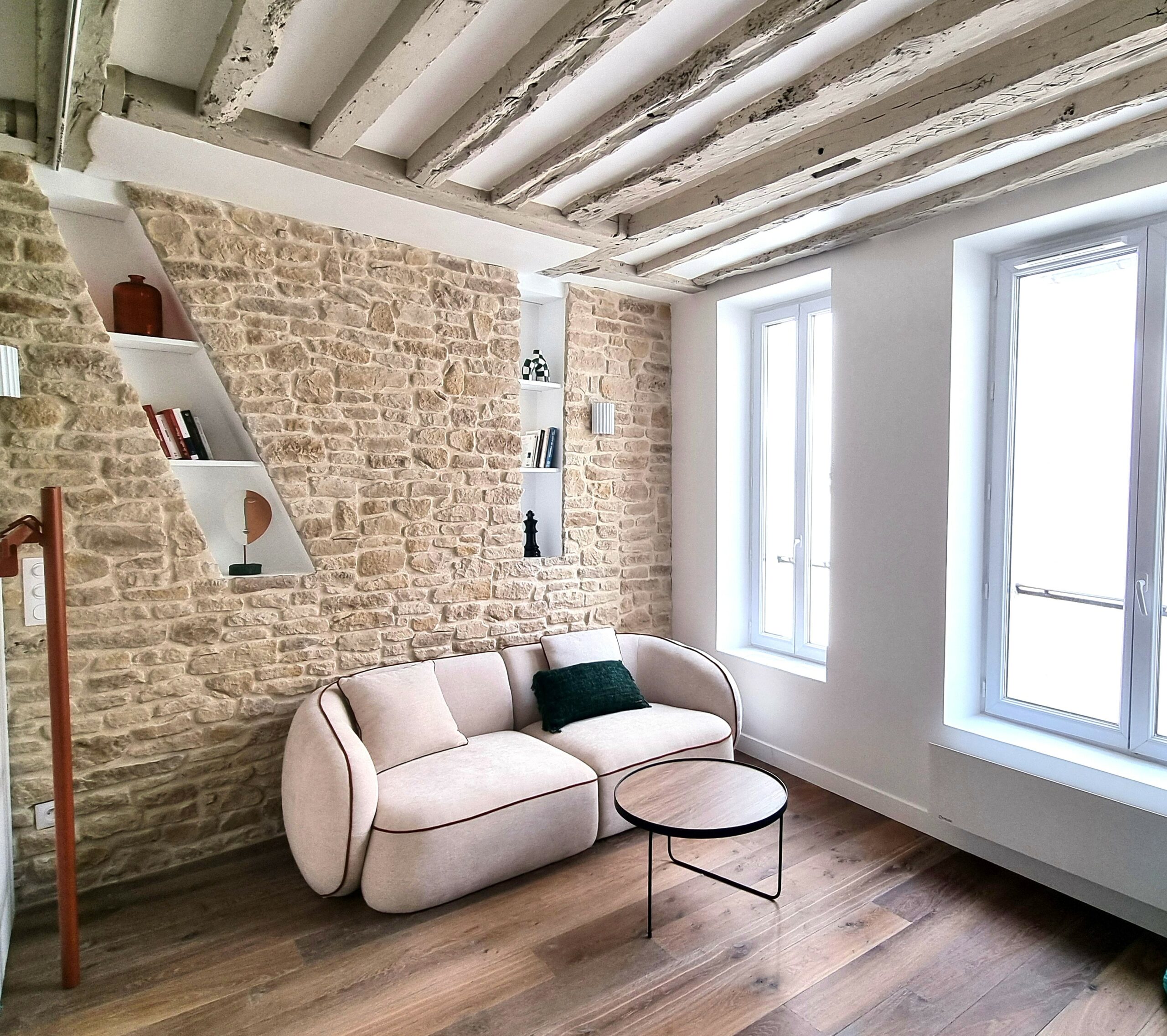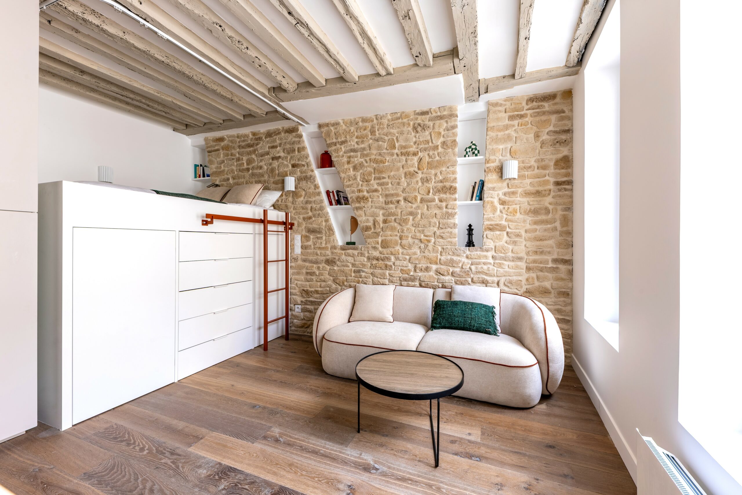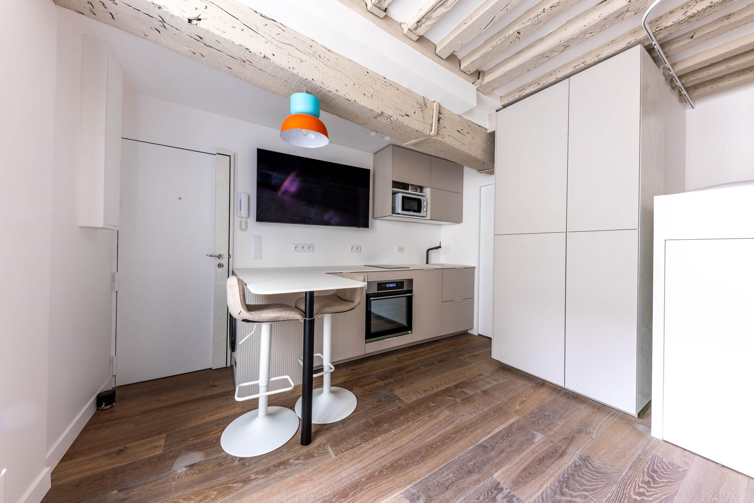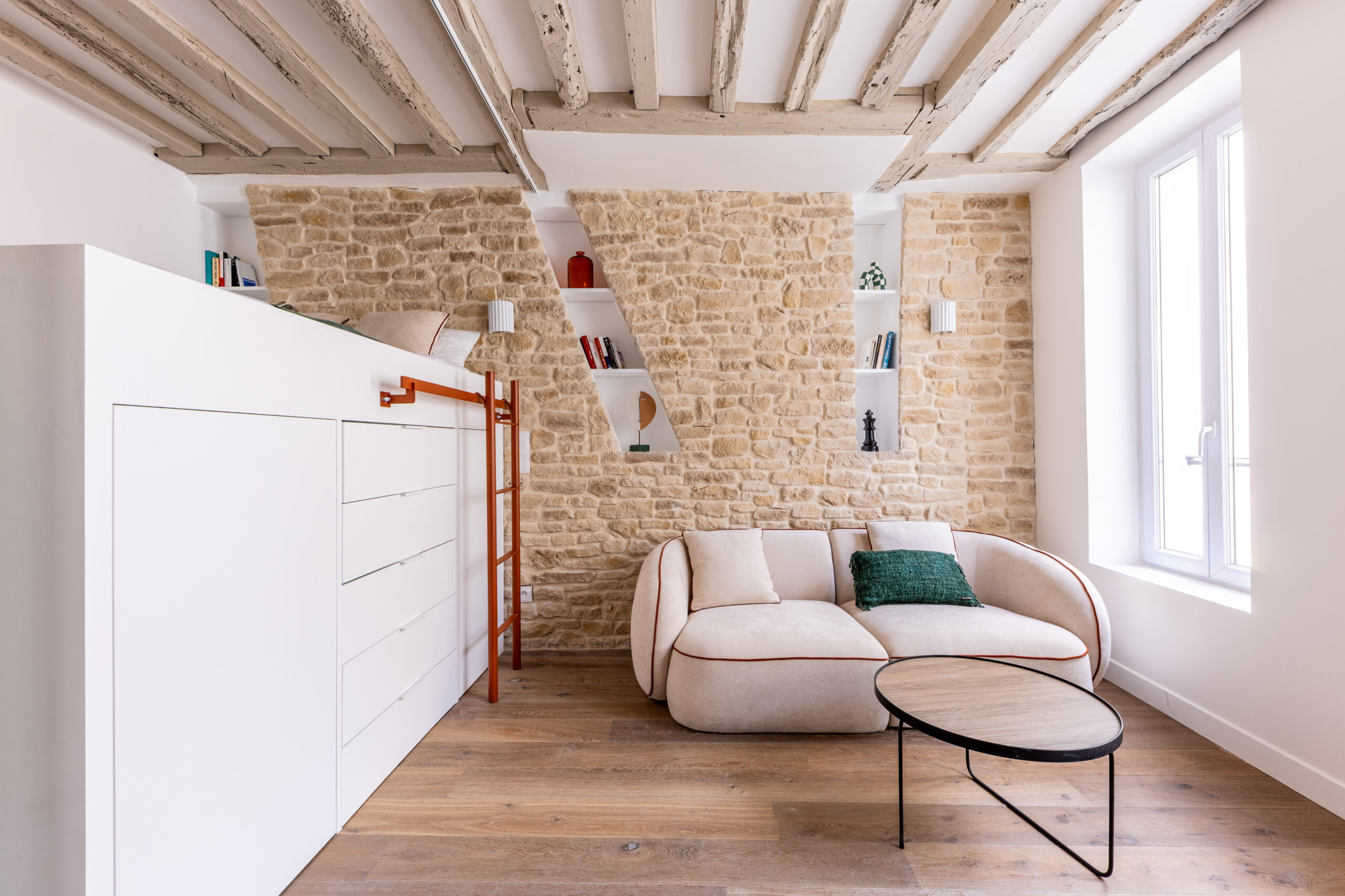Cet appartement cochait toutes les cases : situé dans une impasse du quartier Montorgueil, sans vis-à-vis, et lumineux, il convenait parfaitement pour un investissement locatif. La démolition totale a laissé la place à un grand carré vide et le défi a consisté à l’optimiser au maximum afin de créer une salle de bain, un coin nuit séparé de l’espace à vivre salon/cuisine ainsi que beaucoup de rangements. Les poutres ont été traitées et repeintes et un parement en pierre a été posé sur un des murs pour apporter du cachet à l’ensemble.