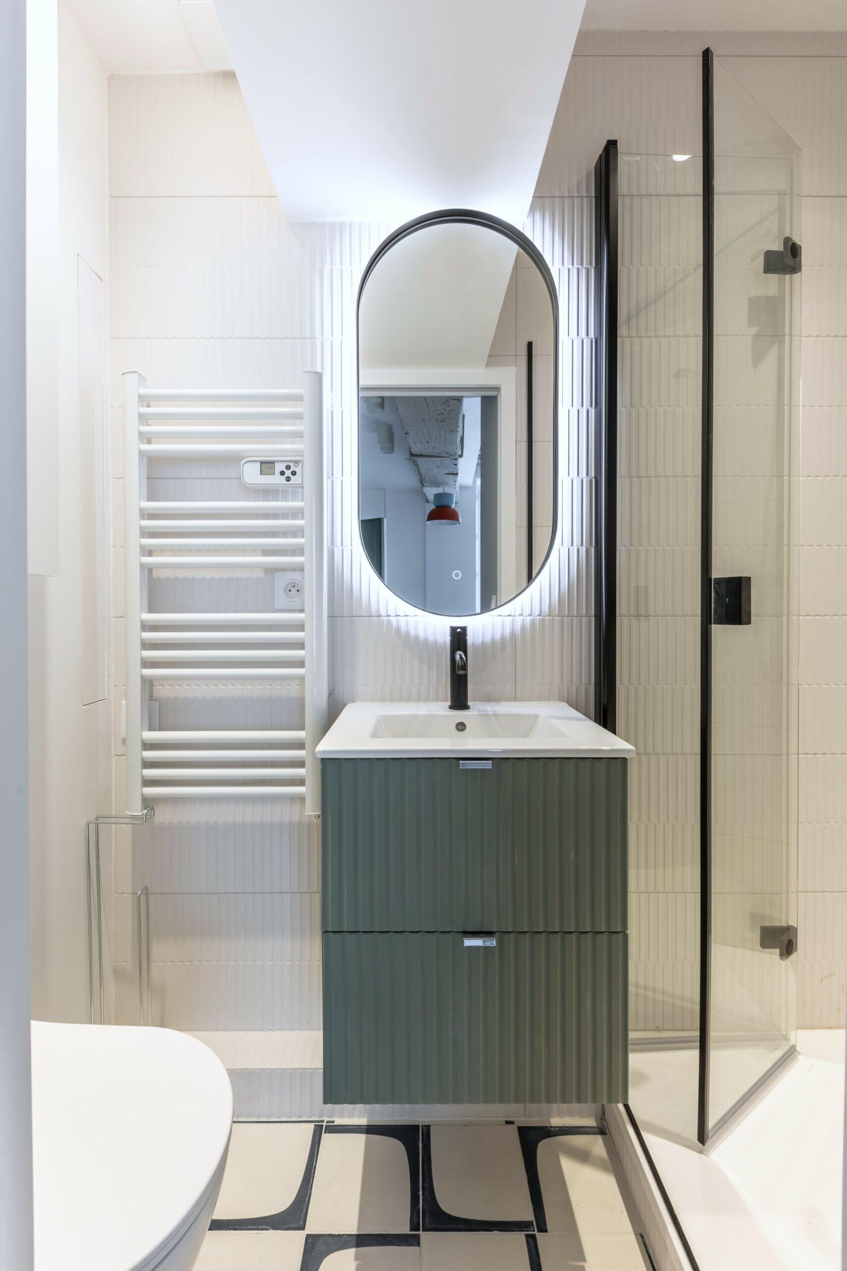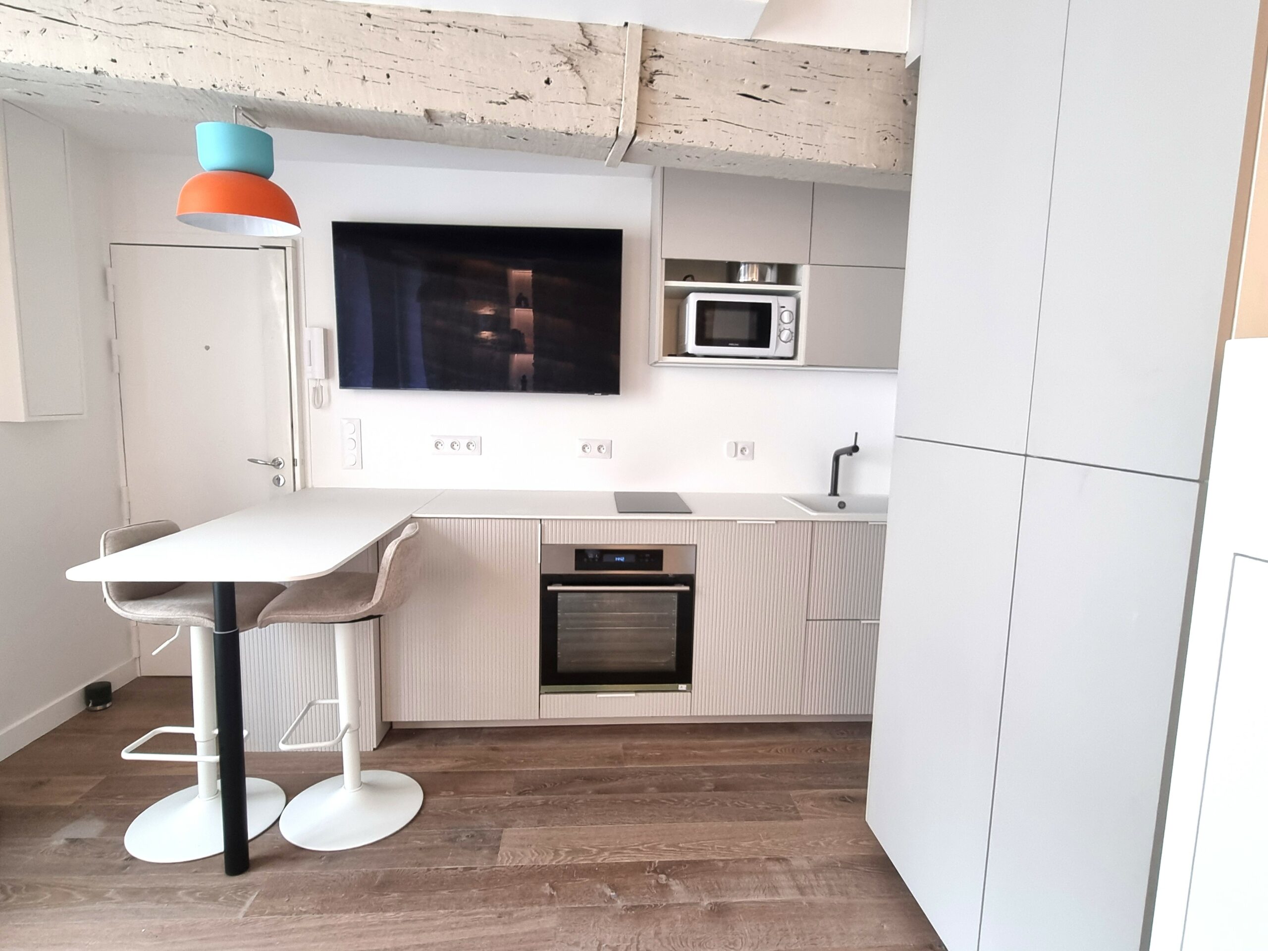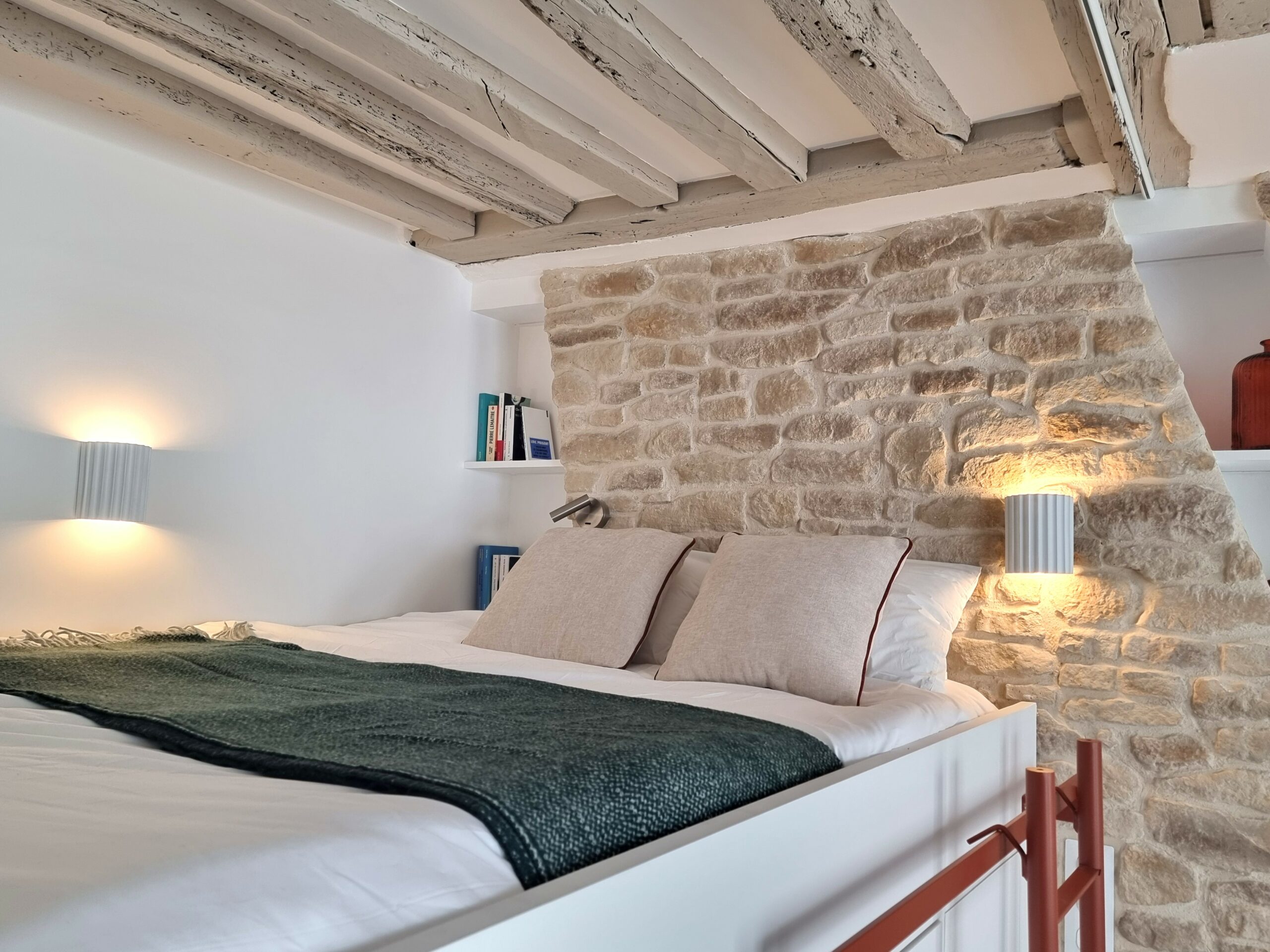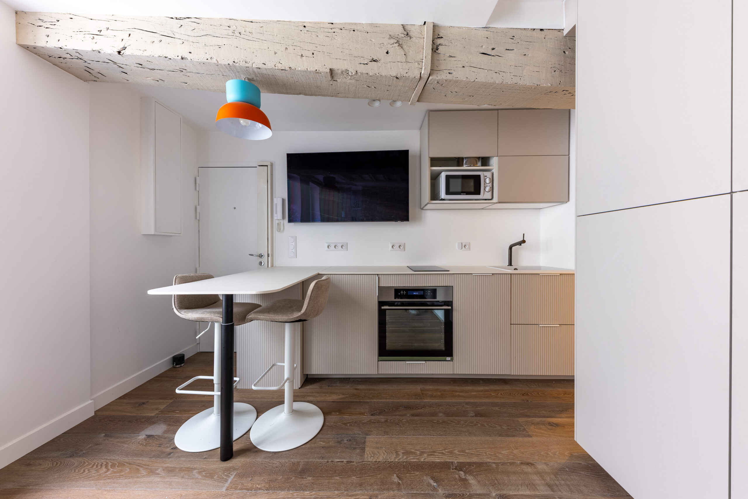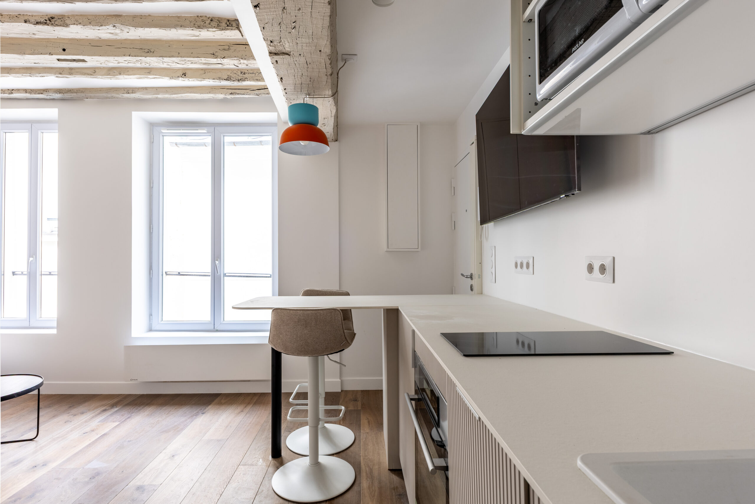 Cet appartement cochait toutes les cases : situé dans une impasse du quartier Montorgueil, sans vis-à-vis, et lumineux, il convenait parfaitement pour un investissement locatif. La démolition totale a laissé la place à un grand carré vide et le défi a consisté à l’optimiser au maximum afin de créer une salle de bain, un coin nuit séparé de l’espace à vivre salon/cuisine ainsi que beaucoup de rangements. Les poutres ont été traitées et repeintes et un parement en pierre a été posé sur un des murs pour apporter du cachet à l’ensemble.